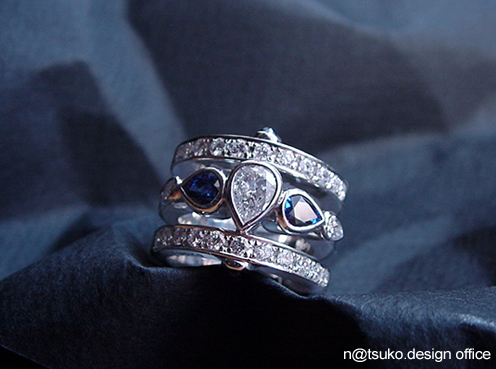 ペアシェープのダイアとサファイアだけの細みのリングを作り変えたもの。