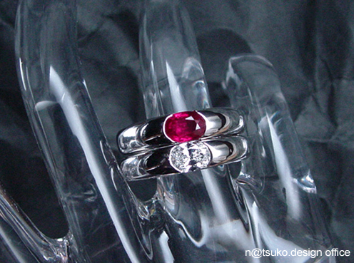 オーバルカットのルビーとダイアで、2本セットのリングを作りました。