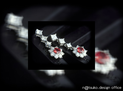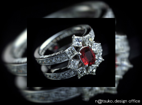 小粒だが良質のルビーをプリンセスカットのダイアで取り巻いたリング。 三角の隙間がとても美しい。 アームには全周にメレ−を留め、裏面にも小さなルビーを留めた。